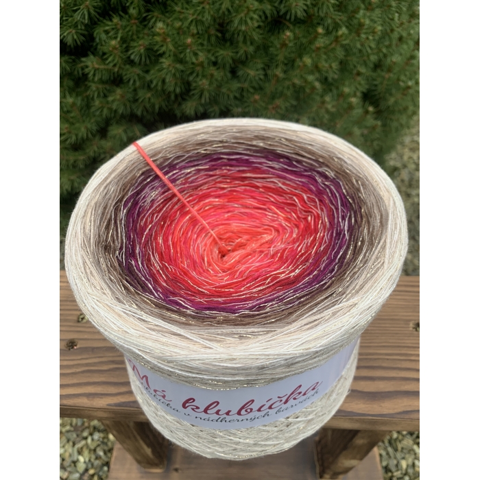 Vlákno je složeno ze 3 nitek s postupnými a jemnými barevnými přechody a 1 nitkou bílého velmi jemného lurexu.